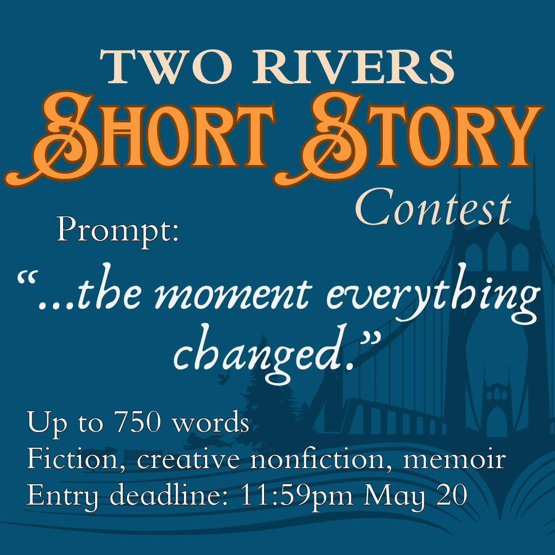 Far below, see information on a different kind of short story contest and public reading I’m jurying with my university students and Two Rivers Books. If you’re in the greater Portland, Oregon area, this is your last weekend to submit!